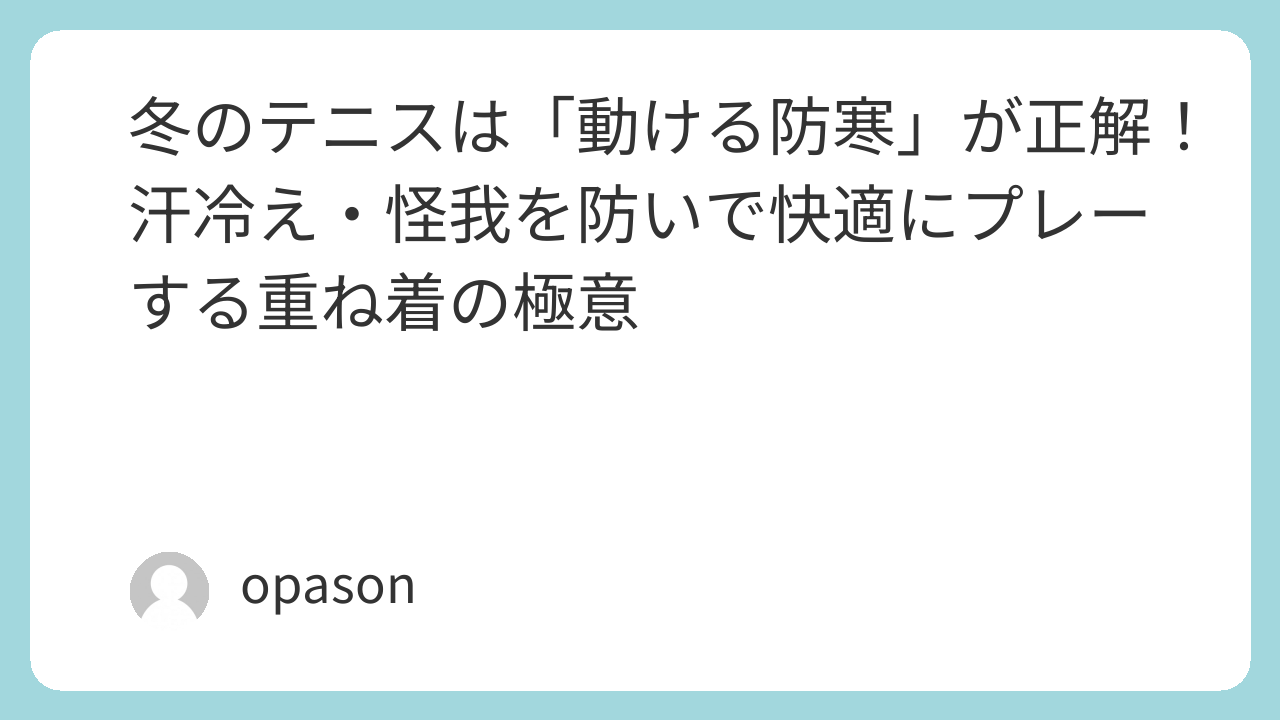 冬はコートが空いていることも多く、集中して練習できる絶好の季節です。「寒いから外に出たくない」と思う前に、まずはウェアを見直してみてください。