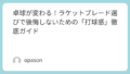 直接手が触れる、最も重要なインターフェースです。太さは「G2」や「G3」といった規格で表されます。私は手が小さい方なのですが、無理に太いグリップを使っていた時は無駄な力が入ってしまい、すぐに握力が切れていました。自分の手に合った太さを知り、グリップテープをこまめに巻き直すだけで、コントロール力は格段に上がります。