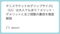 これが最大の利点です。G0をベースにすれば、厚手のオーバーグリップを巻いてG0.5にしたり、元グリの下にグリップチューブを装着して自分専用の太さにカスタマイズしたりできます。最初から太いラケットを買って「やっぱり細くしたい」と思っても、フレームを削るわけにはいきませんから。