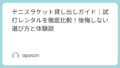 一番の失敗は「デザインだけで選んで、コートでの実戦を想定しないこと」です。必ず厚手のテニス用ソックスを履いた状態で、踵を合わせてシューレースを締め、つま先に5mm程度の余裕があるかを確認してください。