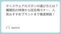 特にヨネックスやミズノなど、国内メーカーの「公認」モデルを選べば安心ですが、デザイン重視でフィラやエレッセを選ぶ際は、必ず「ITF(国際テニス連盟)/JTA公認」の記述があるか確認しましょう。襟の有無や、背面のプリントなど、意外な落とし穴があるのが公式戦の面白い(そして恐ろしい)ところです。