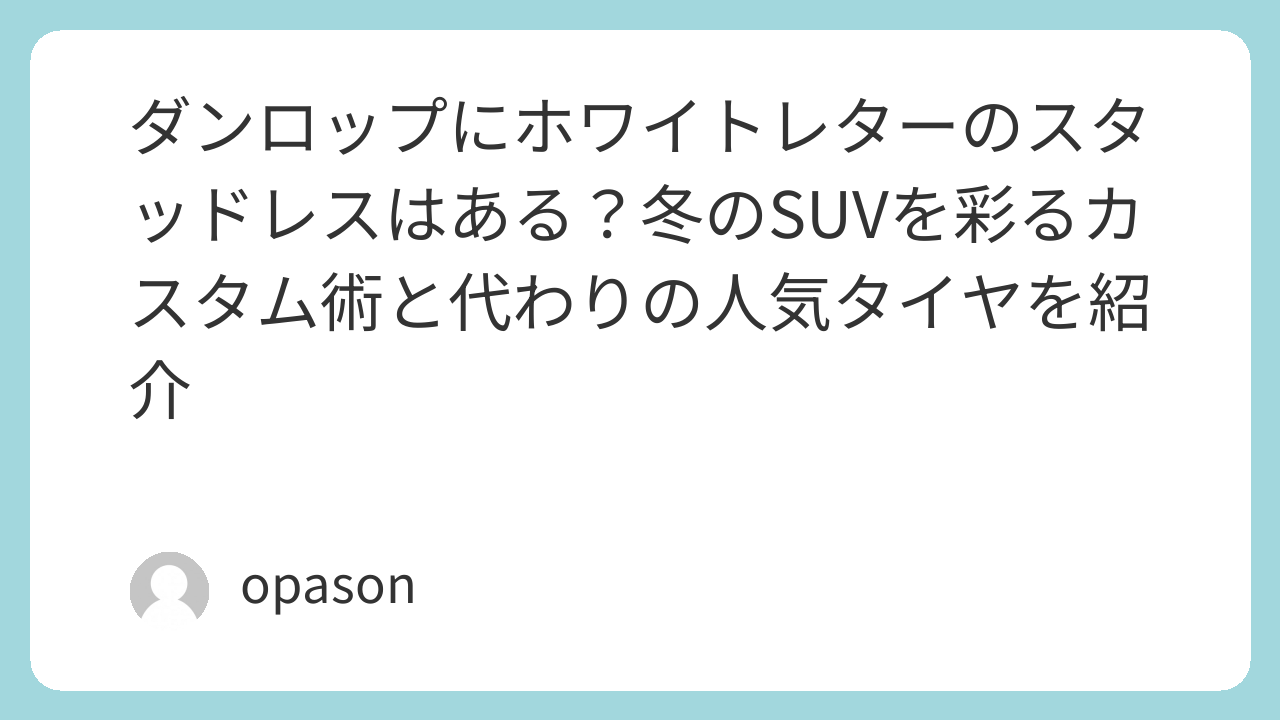 「冬でも愛車の足元をカッコよく決めたい!」そう思ってダンロップのスタッドレスを探しているあなたへ。ハイエースやデリカ、RAV4といったアクティブな車に乗っていると、どうしてもあの「白い文字(ホワイトレター)」の誘惑には勝てませんよね。